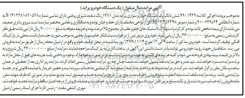 تاریخ مزایده ساعت 9 الی 12 مورخ 99.11.14 روز سه شنبه در محل توقیف خودرو واقع در اردبیل محله زینال