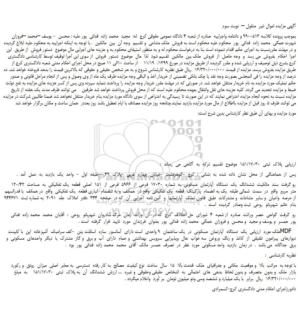 بموجب پرونده کلاسه 9900513 و دادنامه واجراییه  صادره از شعبه 4 دادگاه عمومی حقوقی کرج  له:  مجید  محمد زاده  قدائی  پور علیه : محسن  - یوسف –محمد –فروزان  شهرت همگی  محمد زاده  فدائی  پور  محکوم علیه محکوم است به فروش  ملک مشاعی  و تقسیم  وجه آن  بین  مالکین  . با توجه به اینکه اجراییه به محکوم علیه ابلاغ گردیده و در مهلت مقررنسبت به اجرای حکم اقدام ننموده است بنا به درخواست محکوم له و به منظور استیفای محکوم به و هزینه های اجرایی مال موضوع  دستور فروش  از طریق  این اجرا  احکام  بفروش  می رسد  و  وجه حاصل  از  فروش  ملک بین  مالکین  تقسیم شود  لذا  مال  موضوع  دستور  فروش  از سوی این اجرا توقیف توسط کارشناسی دادگستری کرج بشرح ذیل توصیف و ارزیابی شده و مقرر گردیده از طریق مزایده در مورخ 1399/  11/19    از ساعت 10الی 11 صبح در محل اجرای احکام مدنی شعبه دادگستری کرج از طریق مزایده بفروش برسد. مزایده از قیمت 16/320/000/000  ریال طبق نظریه کارشناس شروع و به هر شخص حقیقی و حقوقی که بالاترین قیمت را بدهد فروخته خواهد شد. ده درصد از وجه مزایده را فی المجلس بصورت وجه نقد یا چک بانکی تضمینی از خریدار اخذ و الباقی وجه مزایده ظرف یک ماه از وی وصول و پس از انجام مراحل قانونی و صدور حکم تملیک مورد مزایده به نام خریدار منتقل خواهد شد. در صورتی که در مهلت مقرر خریدار وجه مزایده را پرداخت ننماید سپرده وی پس از کسر هزینه های مزایده به نفع دولت ضبط و مزایده تجدید می گردد. کلیه هزینه های نقل وانتقال بعهده محکوم علیه است که از محل فروش پرداخت خواهد شد طرفین    می توانند ظرف مدت یک هفته از تاریخ مزایده نسبت به نحوه انجام مزایده اعتراض نمایند که در این صورت تا رسیدگی به اعتراض از سوی دادگاه مورد مزایده بنام خریدار منتقل نخواهد شد ضمنا طالبین شرکت در مزایده می توانند ظرف 5 روز قبل از مزایده بااطلاع از مال مورد مزایده بازدید نمایند.چنانجه روز مزایده مصادف با ایام تعطیل باشد روز بعددر  همان ساعت و مکان برگزار خواهد شد