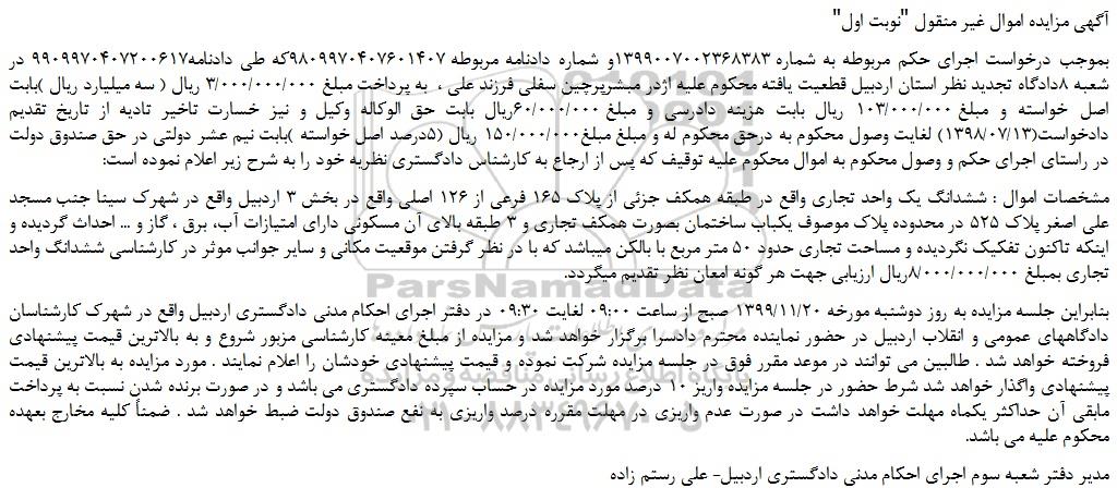 مشخصات اموال : ششدانگ یک واحد تجاری واقع در طبقه همکف جزئی از پلاک 165 فرعی از 126 اصلی واقع در بخش 3 اردبیل واقع در شهرک سینا جنب مسجد علی اصغر پلاک 525 در محدوده پلاک موصوف یکباب ساختمان بصورت همکف تجاری و 3 طبقه بالای آن مسکونی دارای امتیازات آب، برق ، گاز و ... احداث گردیده و اینکه تاکنون تفکیک نگردیده و مساحت تجاری حدود 50 متر مربع با بالکن میباشد که با در نظر گرفتن موقعیت مکانی و سایر جوانب موثر در کارشناسی ششدانگ واحد تجاری بمبلغ 8/000/000/000ریال ارزیابی جهت هر گونه امعان نظر تقدیم میگردد.