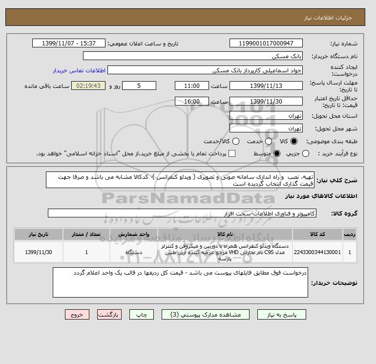 شرح کلی نیاز: تهیه، نصب و راه اندازی سامانه صوتی و تصویری ( ویدئو کنفرانس )- کدکالا مشابه می باشد و صرفا جهت قیمت گذاری انتخاب گردیده است