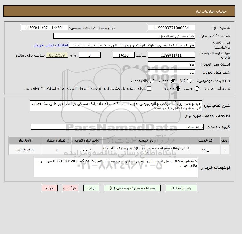 شرح کلی نیاز: تهیه و نصب رول آپ فولادی و آلومینیومی جهت 4 دستگاه ساختمان بانک مسکن در استان یزدطبق مشخصات فنی و شرایط فایل های پیوست