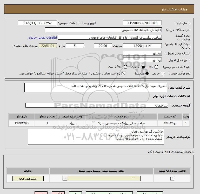 شرح کلی نیاز: تعمیرات مورد نیاز کتابخانه های عمومی شهرستانهای بوشهر و دشتستان