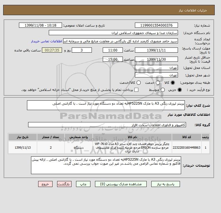 شرح کلی نیاز: پرینتر لیزری رنگی A3 با مارک HP5225Nبه تعداد دو دستگاه مورد نیاز است . با گارانتی اصلی