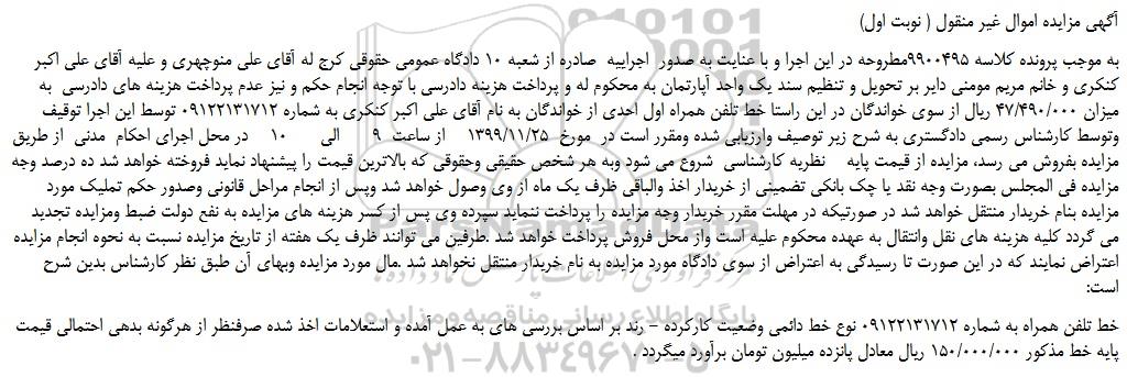 به موجب پرونده کلاسه 9900495مطروحه در این اجرا و با عنایت به صدور اجراییه صادره از شعبه 10 دادگاه عمومی حقوقی کرج له آقای علی منوچهری و علیه آقای علی اکبر کنکری و خانم مریم مومنی دایر بر تحویل و تنظیم سند یک واحد آپارتمان به محکوم له و پرداخت هزینه دادرسی با توجه انجام حکم و نیز عدم پرداخت هزینه های دادرسی به میزان 47/490/000 ریال از سوی خواندگان در این راستا خط تلفن همراه اول احدی از خواندگان به نام آقای علی اکبر کنکری به شماره 09122131712 توسط این اجرا توقیف وتوسط کارشناس رسمی دادگستری به شرح زیر توصیف وارزیابی شده ومقرر است در مورخ 1399/11/25 از ساعت 9 الی 10 در محل اجرای احکام مدنی از طریق مزایده بفروش می رسد، مزایده از قیمت پایه نظریه کارشناسی شروع می شود وبه هر شخص حقیقی وحقوقی که بالاترین قیمت را پیشنهاد نماید فروخته خواهد شد ده درصد وجه مزایده فی المجلس بصورت وجه نقد یا چک بانکی تضمینی از خریدار اخذ والباقی ظرف یک ماه از وی وصول خواهد شد وپس از انجام مراحل قانونی وصدور حکم تملیک مورد مزایده بنام خریدار منتقل خواهد شد در صورتیکه در مهلت مقرر خریدار وجه مزایده را پرداخت ننماید سپرده وی پس از کسر هزینه های مزایده به نفع دولت ضبط ومزایده تجدید می گردد کلیه هزینه های نقل وانتقال به عهده محکوم علیه است واز محل فروش پرداخت خواهد شد .طرفین می توانند ظرف یک هفته از تاریخ مزایده نسبت به نحوه انجام مزایده اعتراض نمایند که در این صورت تا رسیدگی به اعتراض از سوی دادگاه مورد مزایده به نام خریدار منتقل نخواهد شد .مال مورد مزایده وبهای آن طبق نظر کارشناس بدین شرح است: