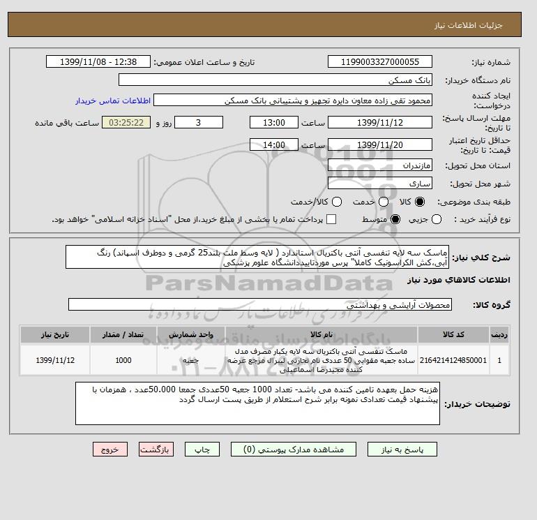 شرح کلی نیاز: ماسک سه لایه تنفسی آنتی باکتریال استاندارد ( لایه وسط ملت بلند25 گرمی و دوطرف اسپاند) رنگ آبی،کش الکراسونیک کاملا" پرس موردتاییددانشگاه علوم پزشکی