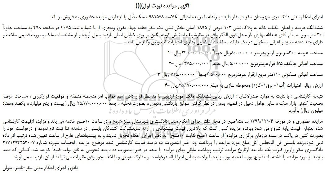 اجرای احکام مدنی دادگستری شهرستان سقز در نظر دارد در رابطه با پرونده اجرائی بکلاسه 981578 ، ملک ذیل را از طریق مزایده حضوری به فروش برساند.