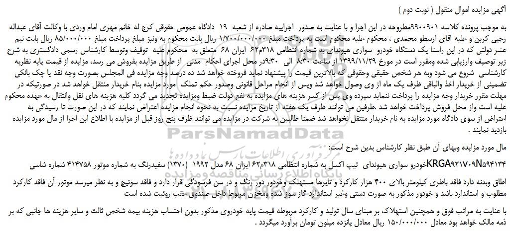 به موجب پرونده کلاسه 9900901مطروحه در این اجرا و با عنایت به صدور  اجراییه صادره از شعبه  19  دادگاه عمومی حقوقی کرج له خانم مهری امام وردی با وکالت آقای عبداله رجبی کرین و علیه آقای ارسطو محمدی ، محکوم علیه محکوم است به پرداخت مبلغ 1/700/000/000 ریال بابت محکوم به ونیز مبلغ پرداخت مبلغ 85/000/000 ریال بابت نیم عشر دولتی که در این راستا یک دستگاه خودرو  سواری هیوندای به شماره انتظامی 318م62  ایران 68  متعلق به  محکوم علیه  توقیف وتوسط کارشناس رسمی دادگستری به شرح زیر توصیف وارزیابی شده ومقرر است در مورخ 1399/11/29 از ساعت 8:30  الی  9:30در محل اجرای احکام  مدنی  از طریق مزایده بفروش می رسد، مزایده از قیمت پایه نظریه کارشناسی  شروع می شود وبه هر شخص حقیقی وحقوقی که بالاترین قیمت را پیشنهاد نماید فروخته خواهد شد ده درصد وجه مزایده فی المجلس بصورت وجه نقد یا چک بانکی تضمینی از خریدار اخذ والباقی ظرف یک ماه از وی وصول خواهد شد وپس از انجام مراحل قانونی وصدور حکم تملک  مورد مزایده بنام خریدار منتقل خواهد شد در صورتیکه در مهلت مقرر خریدار وجه مزایده را پرداخت ننماید سپرده وی پس از کسر هزینه های مزایده به نفع دولت ضبط ومزایده تجدید می گردد کلیه هزینه های نقل وانتقال به عهده محکوم علیه است واز محل فروش پرداخت خواهد شد .طرفین می توانند ظرف یک هفته از تاریخ مزایده نسبت به نحوه انجام مزایده اعتراض نمایند که در این صورت تا رسیدگی به اعتراض از سوی دادگاه مورد مزایده به نام خریدار منتقل نخواهد شد ضمنا طالبین به شرکت در مزایده می توانند ظرف پنج روز قبل از مزایده با اطلاع این اجرا از مال مورد مزایده بازدید نمایند .