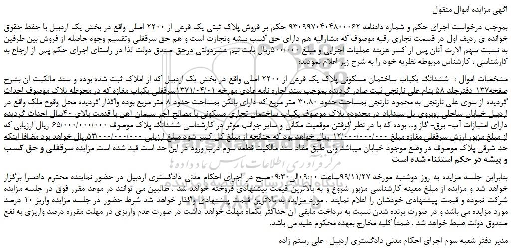 بموجب درخواست اجرای حکم و شماره دادنامه 9309970404800062 حکم بر فروش پلاک ثبتی یک فرعی از 2200 اصلی واقع در بخش یک اردبیل با حفظ حقوق خوانده ی ردیف اول در قسمت تجاری رقبه موصوف که مشارالیه هم دارای حق کسب پیشه وتجارت است و هم حق سرقفلی وتقسیم وجوه حاصله از فروش بین طرفین به نسبت سهم الارث آنان پس از کسر هزینه عملیات اجرایی و مبلغ 500/000ریال بابت نیم عشردولتی درحق صندق دولت لذا در راستای اجرای حکم پس از ارجاع به کارشناسی ، کارشناس مربوطه نظریه خود را به شرح زیر اعلام نمودند: