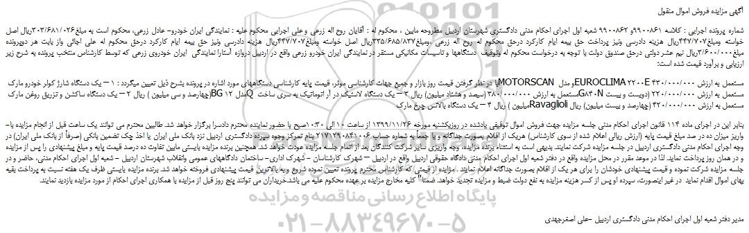 شماره پرونده اجرایی : کلاسه 9900861و 9900862 شعبه اول اجرای احکام مدنی دادگستری شهرستان اردبیل مطروحه مابین ، محکوم له : آقایان روح اله زرعی و علی اجرایی محکوم علیه : نمایندگی ایران خودرو- عادل زرعی، محکوم است به مبلغ303/681/026ریال اصل خواسته ومبلغ447/707ریال هزینه دادرسی ونیز پرداخت حق بیمه ایام کارکرد درحق محکوم له روح اله زرعی ،ومبلغ335/685/837ریال اصل خواسته ومبلغ447/707ریال هزینه دادرسی ونیز حق بیمه ایام کارکرد درحق محکوم له علی اجائی واز بابت هر دوپرونده مبلغ3/600/000ریال نیم عشر دولتی درحق صندوق دولت با توجه به درخواست محکوم له وتوقیف  دستگاهها و تاسیسات مکانیکی مستقر در نمایندگی ایران خودرو زرعی واقع در اردبیل دروازه آستارا نمایندگی  ایران خودروی زرعی که توسط کارشناس منتخب پرونده به شرح زیر ارزیابی و برآورد قیمت شده است؛
