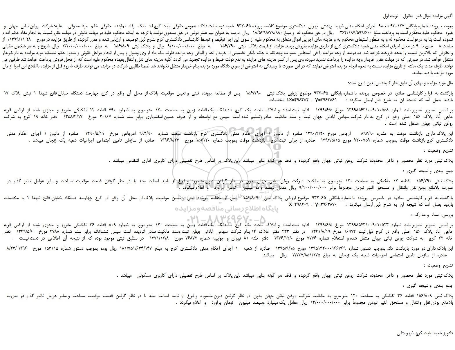 بموجب پرونده شماره بایگانی 930127 شعبه9 اجرای احکام مدنی شهید بهشتی تهران دادگستری موضوع کلاسه پرونده 932065 شعبه دوم نیابت دادگاه عمومی حقوقی نیابت کرج له: بانک رفاه نماینده حقوقی خانم مینا صدوقی علیه: شرکت روغن نباتی جهان و غیره محکوم علیه محکوم است به پرداخت مبلغ 264/197/599/600 ریال در حق محکوم له و مبلغ 18/549/879/980 ریال درصد به عنوان نیم عشر دولتی در حق صندوق دولت. با توجه به اینکه محکوم علیه در مهلت قانونی در مهلت مقرر نسبت به انجام مفاد حکم اقدام ننموده است بنا به درخواست محکوم له و به منظور استیفای محکوم به و هزینه های اجرایی اموال متعلق به محکوم علیه از سوی این اجرا توقیف و توسط کارشناسی دادگستری کرج بشرح ذیل توصیف و ارزیابی شده و مقرر گردیده از طریق مزایده در مورخ 28 1399/11/ از ساعت 8 صبح تا 9 در محل اجرای احکام مدنی شعبه دادگستری کرج از طریق مزایده بفروش برسد. مزایده از قیمت پلاک ثبتی 156/790 به مبلغ 9/100/000/000 ریال و پلاک ثبتی 156/809 به مبلغ 13/000/000/000 ریال شروع و به هر شخص حقیقی و حقوقی که بالاترین قیمت را بدهد فروخته خواهد شد. ده درصد از وجه مزایده را فی المجلس بصورت وجه نقد یا چک بانکی تضمینی از خریدار اخذ و الباقی وجه مزایده ظرف یک ماه از وی وصول و پس از انجام مراحل قانونی و صدور حکم تملیک مورد مزایده به نام خریدار منتقل خواهد شد. در صورتی که در مهلت مقرر خریدار وجه مزایده را پرداخت ننماید سپرده وی پس از کسر هزینه های مزایده به نفع دولت ضبط و مزایده تجدید می گردد. کلیه هزینه های نقل وانتقال بعهده محکوم علیه است که از محل فروش پرداخت خواهد شد طرفین می توانند ظرف مدت یک هفته از تاریخ مزایده نسبت به نحوه انجام مزایده اعتراض نمایند که در این صورت تا رسیدگی به اعتراض از سوی دادگاه مورد مزایده بنام خریدار منتقل نخواهد شد ضمنا طالبین شرکت در مزایده می توانند ظرف 5 روز قبل از مزایده بااطلاع این اجرا از مال مورد مزایده بازدید نمایند.