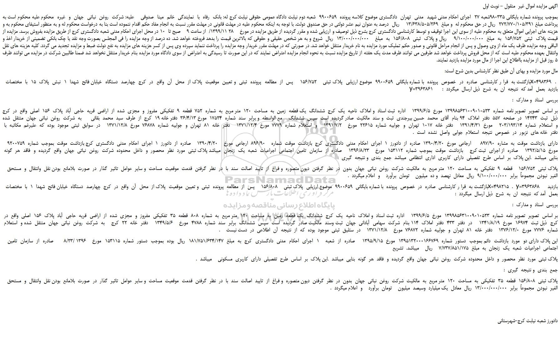 بموجب پرونده شماره بایگانی 980335شعبه 27  اجرای احکام مدنی شهید  مدنی  تهران  دادگستری موضوع کلاسه پرونده  9900659  شعبه دوم نیابت دادگاه عمومی حقوقی نیابت کرج له: بانک  رفاه  با  نمایندگی  خانم  مینا  صدوقی    علیه: شرکت  روغن  نباتی  جهان  و  غیره  محکوم علیه محکوم است به پرداخت مبلغ 272/770/105/391  ریال در حق محکوم له  و مبلغ  13/638/505/269    ریال  درصد به عنوان نیم عشر دولتی در حق صندوق دولت. با توجه به اینکه محکوم علیه در مهلت قانونی در مهلت مقرر نسبت به انجام مفاد حکم اقدام ننموده است بنا به درخواست محکوم له و به منظور استیفای محکوم به و هزینه های اجرایی اموال متعلق به محکوم علیه از سوی این اجرا توقیف و توسط کارشناسی دادگستری کرج بشرح ذیل توصیف و ارزیابی شده و مقرر گردیده از طریق مزایده در مورخ    28 1399/11/  از ساعت 9    صبح تا  10 در محل اجرای احکام مدنی شعبه دادگستری کرج از طریق مزایده بفروش برسد. مزایده از قیمت پلاک  ثبتی  156/752  به  مبلغ  9/100/000/000    ریال و پلاک  ثبتی  156/808  به  مبلغ    13/000/000/000  ریال  شروع و به هر شخص حقیقی و حقوقی که بالاترین قیمت را بدهد فروخته خواهد شد. ده درصد از وجه مزایده را فی المجلس بصورت وجه نقد یا چک بانکی تضمینی از خریدار اخذ و الباقی وجه مزایده ظرف یک ماه از وی وصول و پس از انجام مراحل قانونی و صدور حکم تملیک مورد مزایده به نام خریدار منتقل خواهد شد. در صورتی که در مهلت مقرر خریدار وجه مزایده را پرداخت ننماید سپرده وی پس از کسر هزینه های مزایده به نفع دولت ضبط و مزایده تجدید می گردد. کلیه هزینه های نقل وانتقال بعهده محکوم علیه است که از محل فروش پرداخت خواهد شد طرفین می توانند ظرف مدت یک هفته از تاریخ مزایده نسبت به نحوه انجام مزایده اعتراض نمایند که در این صورت تا رسیدگی به اعتراض از سوی دادگاه مورد مزایده بنام خریدار منتقل نخواهد شد ضمنا طالبین شرکت در مزایده می توانند ظرف 5 روز قبل از مزایده بااطلاع این اجرا از مال مورد مزایده بازدید نمایند.