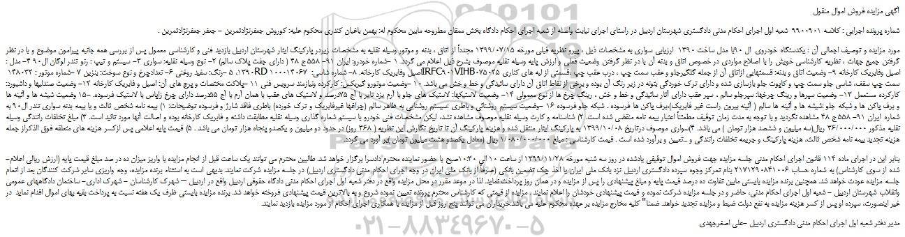 شماره پرونده اجرایی : کلاسه 9900901 شعبه اول اجرای احکام مدنی دادگستری شهرستان اردبیل در راستای اجرای نیابت واصله از شعبه اجرای احکام دادگاه بخش ممقان مطروحه مابین محکوم له: بهمن باغبان کندری محکوم علیه: کوروش جعفرنژادثمرین - جعفر جعفرنژادثمرین .