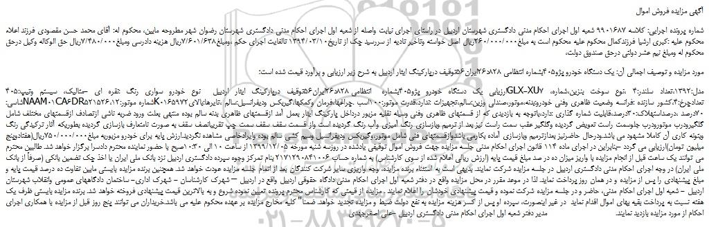 ارزیابی یک دستگاه خودرو پژو405بشماره انتظامی 828د26ایران56توقیف درپارکینگ ایثار اردبیل نوع خودرو سواری رنگ :نقره ای -متالیک، سیستم وتیپ:405GLX-XU7 ،مدل:1392،تعداد سلندر:4 ،نوع سوخت بنزین،شماره شاسی:NAAM01CA6DR521526،شماره موتور:12K0165972تعدادچرخ:4،کشور سازنده :فرانسه وضعیت ظاهری وفنی خودرو:بدنه،موتور،صندلی وزین:سالم،تجهیزات :ندارد،قدرت موتور:100اسب .چراغها،فرمان وکمکها،گیربکس ودیفرانسیل:سالم ،تایرها:بالای 70درصد ،درصداستهلاک:30درصد،قابلیت شماره گذاری :دارد،باتوجه به بازدیدی که از قسمتهای ظاهری وفنی وسیله نقلیه مزبور درداخل پارکینگ ایثار بعمل آمد ازقسمتهای ظاهری بدنه سالم بوده منتهی بعلت ورود ضربه ناشی ازتصادف ازقسمتهای مختلف شامل گلگیرودرب موتورودرب جلوسمت راست تعویض گردیده وگلگیر عقب سمت راست نیز بعد از ترمیم وبازسازی رنگ آمیزی وآب رنگ گردیده است واز قسمت سقف سقف سمت چپ تقریبانصف سقف به صورت نامتعارف بازسازی گردیده بطوریکه آثار ترکیدگی رنگ وبتونه کاری آن کاملا مشهود می باشد.ودرحال حاضرنیز بعدازترمیم وبازسازی آماده بکارمی باشدوازقسمتهای فنی شامل موتور،وگیربکس ودیفرانسیل وسیم کشی سالم بوده وایرادخاصی مشاهده نگردید.ارزش پایه برای خودرو مزبوربه مبلغ750/000/000ریال(هفتادوپنج میلیون تومان)ارزیابی می گردد -بنابراین در اجرای ماده 114 قانون اجرای احکام مدنی جلسه مزایده جهت فروش اموال توقیفی یادشده در روزسه شنبه مورخه 1399/12/05 از ساعت 10 الی 10:30صبح با حضور نماینده محترم دادسرا برگزار خواهد شد. طالبین محترم می توانند یک ساعت قبل از انجام مزایده با واریز میزان ده در صد مبلغ قیمت پایه (ارزش ریالی اعلام شده از سوی کارشناس) به شماره حساب 2171290841006 بنام تمرکز وجوه سپرده دادگستری اردبیل نزد بانک ملی ایران یا اخذ چک تضمین بانکی (صرفاً از بانک ملی ایران) در وجه اجرای احکام مدنی دادگستری اردبیل در جلسه مزایده شرکت نمایند. بدیهی است به استثناء برنده مزایده، وجه واریزی سایر شرکت کنندگان بعد از اتمام جلسه مزایده عودت خواهد شد. همچنین برنده مزایده بایستی مابین تفاوت ده درصد قیمت پایه و مبلغ پیشنهادی را پس از مزایده و در همان روز پرداخت نماید. لذا در موعد مقرر در محل مزایده واقع در دفتر شعبه اول اجرای احکام مدنی دادگاه حقوقی اردبیل واقع در اردبیل – شهرک کارشناسان - شهرک اداری- ساختمان دادگاههای عمومی وانقلاب شهرستان اردبیل - شعبه اول اجرای احکام مدنی، حاضر و در جلسه مزایده شرکت نموده و قیمت پیشنهادی خودشان را اعلام نمایند . مزایده از قیمتی که کارشناس محترم پرونده تعیین نموده شروع و به بالاترین قیمت پیشنهادی فروخته خواهد شد. برنده مزایده بایستی ظرف یک هفته نسبت به پرداخت بقیه بهای اموال اقدام نماید در غیر اینصورت، سپرده او پس از کسر هزینه مزایده به نفع دولت ضبط و مزایده تجدید خواهد. ضمنا" کلیه مخارج مزایده بر عهده محکوم علیه می باشد.خریداران می توانند پنج روز قبل از مزایده با همکاری اجرای احکام از مورد مزایده بازدید نمایند. مدیر دفتر شعبه اول اجرای احکام مدنی دادگستری اردبیل -علی اصغرجهدی