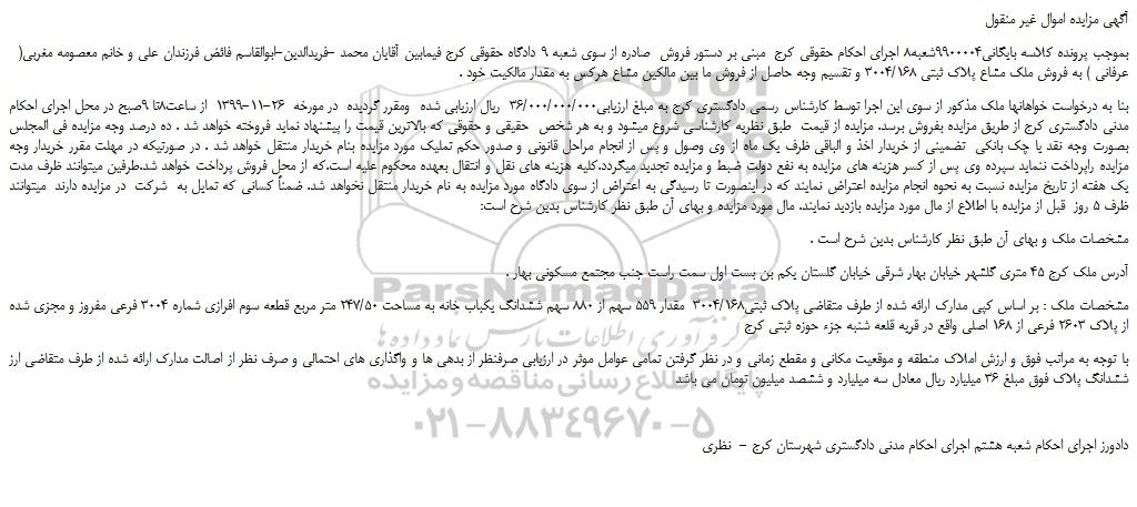 بموجب پرونده کلاسه بایگانی9900004شعبه8 اجرای احکام حقوقی کرج مبنی بر دستور فروش صادره از سوی شعبه ۹ دادگاه حقوقی کرج فیمابین آقایان محمد -فریدالدین-ابوالقاسم فائض فرزندان علی و خانم معصومه مغربی( عرفانی ) به فروش ملک مشاع پلاک ثبتی 3004/168 و تقسیم وجه حاصل از فروش ما بین مالکین مشاع هرکس به مقدار مالکیت خود .