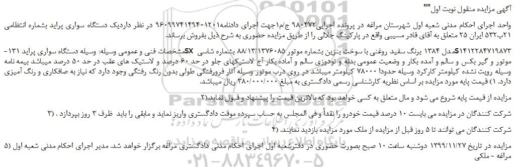 مشخصات فنی و عمومی وسیله: وسیله دستگاه سواری پراید 131-sx مدل 1384 برنگ سفید روغنی با سوخت بنزین بشماره موتور 88/13/1376085 بشماره شاسی s1412284719873 موتور و گیر بکس و سالم و آمده بکار و وضعیت عمومی بدنه و تودوزی سالم و آماده بکار آج لاستیکهای جلو در حد 60 درصد و لاستیک های عقب در حد 50 درصد میباشد بیمه نامه وسیله رویت نشده کیلومتر کارکرد وسیله حدودا 78000 کیلومتر میباشد در روی درب موتور وسیله آثار فرورفتگی طولی بدون رنگ رفتگی وجود دارد که نیاز به صافکاری و رنگ آمیزی دارد. 1) قیمت پایه مورد مزایده بر اساس نظریه کارشناسی رسمی دادگستری به مبلغ 380/000/000 ریال میباشد.