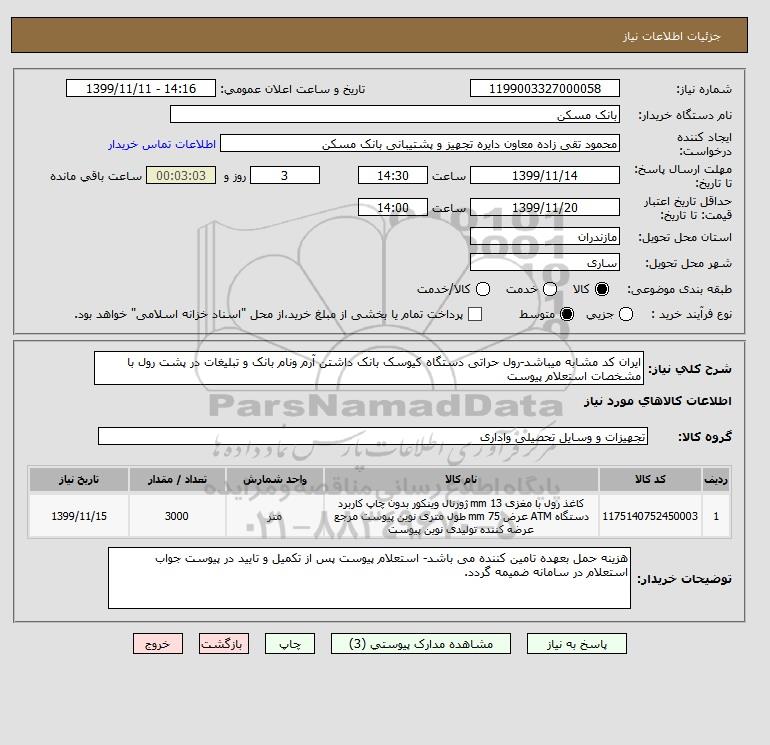 شرح کلی نیاز: ایران کد مشابه میباشد-رول حراتی دستگاه کیوسک بانک داشتن آرم ونام بانک و تبلیغات در پشت رول با مشخصات استعلام پیوست