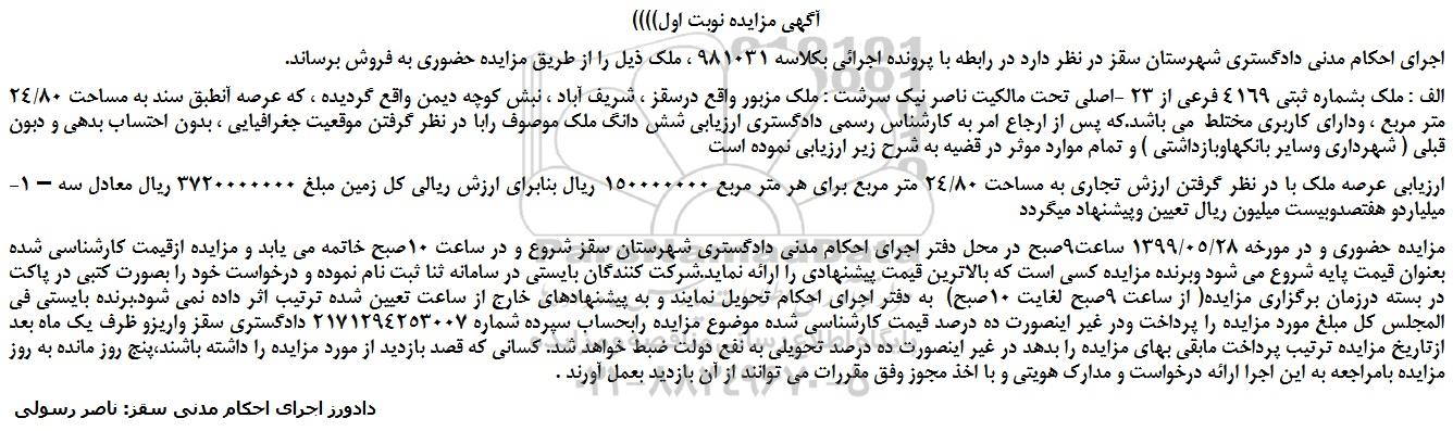 اجرای احکام مدنی دادگستری شهرستان سقز در نظر دارد در رابطه با پرونده اجرائی بکلاسه 981031 ، ملک ذیل را از طریق مزایده حضوری به فروش برساند.