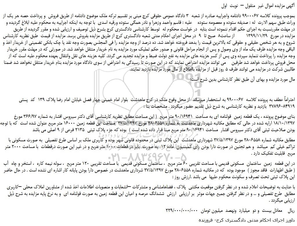 بموجب پرونده کلاسه 9900067 دادنامه واجراییه صادره از شعبه  3 دادگاه عمومی حقوقی کرج مبنی بر تقسیم ترکه ملک موضوع دادنامه از طریق فروش  و پرداخت حصه هر یک از وراث طبق سهم الارث  له : صدیقه ستوده و معصومه ستوده    علیه : قاسم واحمد وزهرا و نادر همگی ستوده ورقیه اسدی  با توجه به اینکه اجراییه به محکوم علیه ابلاغ گردیده و در مهلت مقررنسبت به اجرای حکم اقدام ننموده است بنابه  در خواست محکوم له  توسط کارشناسی دادگستری کرج بشرح ذیل توصیف و ارزیابی شده و مقرر گردیده از طریق مزایده در مورخ  1399/11/29        از ساعت8  صبح تا  9  در محل اجرای احکام مدنی شعبه دادگستری کرج از طریق مزایده بفروش برسد. مزایده از قیمت  طبق نظریه کارشناس شروع و به هر شخص حقیقی و حقوقی که بالاترین قیمت را بدهد فروخته خواهد شد. ده درصد از وجه مزایده را فی المجلس بصورت وجه نقد یا چک بانکی تضمینی از خریدار اخذ و الباقی وجه مزایده ظرف یک ماه از وی وصول و پس از انجام مراحل قانونی و صدور حکم تملیک مورد مزایده به نام خریدار منتقل خواهد شد. در صورتی که در مهلت مقرر خریدار وجه مزایده را پرداخت ننماید سپرده وی پس از کسر هزینه های مزایده به نفع دولت ضبط و مزایده تجدید می گردد. کلیه هزینه های نقل وانتقال بعهده محکوم علیه است که از محل فروش پرداخت خواهد شد طرفین    می توانند مزایده اعتراض نمایند که در این صورت تا رسیدگی به اعتراض از سوی دادگاه مورد مزایده بنام خریدار منتقل نخواهد شد ضمنا طالبین شرکت در مزایده می توانند ظرف 5 روز قبل از مزایده بااطلاع از مال مورد مزایده بازدید نمایند.