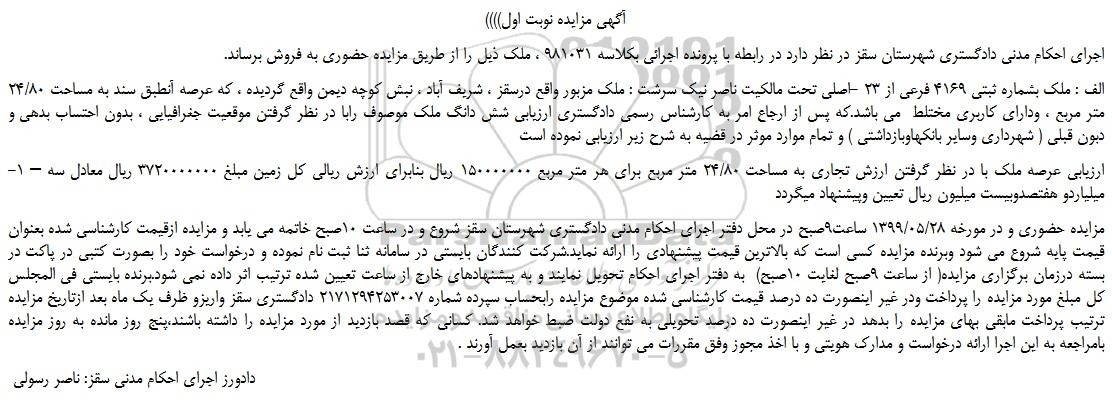 اجرای احکام مدنی دادگستری شهرستان سقز در نظر دارد در رابطه با پرونده اجرائی بکلاسه 981031 ، ملک ذیل را از طریق مزایده حضوری به فروش برساند.