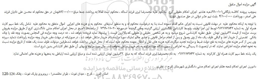 بموجب پرونده کلاسه بایگانی9900101شعبه هشتم اجرای احکام حقوقی کرج محکوم علیه محمدرضا ابری فرزند اسداله ، محکوم است فعلا به پرداخت جمعا مبلغ82/000/000تومان در حق محکوم له محسن علی دادیان فرزند علی اصغر ، وپرداخت 4/100/000 بابت نیم عشر دولتی در حق صندوق دولت