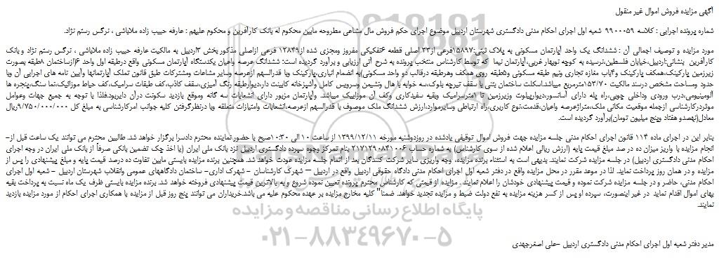 مورد مزایده و توصیف اجمالی آن : ششدانگ یک واحد آپارتمان مسکونی به پلاک ثبتی:15897فرعی از33 اصلی قطعه 6تفکیکی مفروز ومجزی شده از12849 فرعی ازاصلی مذکور بخش 3اردبیل به مالکیت عارفه حبیب زاده ملاباشی ، نرگس رستم نژاد و بانک کارآفرین  بنشانی:اردبیل،خیابان فلسطین،نرسیده به کوچه نوبهار غربی،آپارتمان نیما  که توسط کارشناس منتخب پرونده به شرح آتی ارزیابی و برآورد گردیده است؛ ششدانگ عرصه واعیان یکدستگاه آپارتمان مسکونی واقع درطبقه اول واحد 6(ازساختمان 8طبقه بصورت زیرزمین پارکینک،همکف پارکینک و4باب مغازه تجاری ونیم طبقه مسکونی و5طبقه روی همکف وهرطبقه درقالب دو واحد مسکونی)به انضمام انباری،پارکینک وبا قدرالسهم ازعرصه وسایر مشاعات ومشترکات طبق قانون تملک آپارتمانها وآیین نامه های اجرایی آن وبا حدود ومساحت مشخص درسند مالکیت 153/70مترمربع میباشد.اسکلت ساختمان بتنی با سقف تیرچه بلوک،سه خوابه با هال ونشیمن وسرویس کامل وآشپزخانه کابینت دار،دیوارطبقه رنگ آمیزی،سقف کاذب،کف طبقات سرامیک،کف حیاط موزائیک،نما سنگ،پنجره ها آلومینیومی،درب ورودی وداخلی چوبی،راه پله دارای آسانسور،دیوارپیلوت وزیرزمین تا 1مترسرامیک وبقیه سفیدکاری وکف آن موزاییک میباشد. وآپارتمان مزبور دارای انشعابات سه گانه وموقع بازدید سکونت درآن دایربود.فلذا با توجه به جمیع جهات وعوامل موثردرکارشناسی ازجمله موقعیت مکانی ملک،متراژعرصه واعیان،قدمت،نوع کاربری،راه ارتباطی وسایرموارد،ارزش ششدانگ ملک موصوف با قدرالسهم ازعرصه،انشعابات وامتیازات متعلقه وبا درنظرگرفتن کلیه جوانب امرکارشناسی به مبلغ کل 9/750/000/000ریال معادل(نهصدو هفتاد وپنج میلیون تومان)برآورد گردیده است.