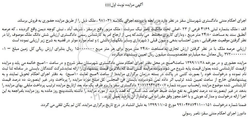 اجرای احکام مدنی دادگستری شهرستان سقز در نظر دارد در رابطه با پرونده اجرائی بکلاسه 981031 ، ملک ذیل را از طریق مزایده حضوری به فروش برساند.
