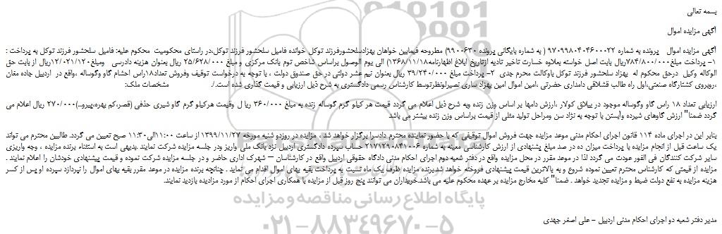 آگهی مزایده اموال پرونده به شماره 9709980404600022 ( به شماره بایگانی پرونده 9900630) مطروحه فیمابین خواهان بهزادسلحشورفرزند توکل خوانده فامیل سلحشور فرزند توکل،در راستای محکومیت محکوم علیه: فامیل سلحشور فرزند توکل به پرداخت : 1- پرداخت مبلغ784/800/000ریال بابت اصل خواسته بعلاوه خسارت تاخیر تادیه ازتاریخ ابلاغ اظهارنامه1368/11/18) الی یوم الوصول براساس شاخص توم بانک مرکزی و مبلغ 25/628/000 ریال بعنوان هزینه دادرسی ومبلغ12/021/120ریال از بابت حق الوکاله وکیل درحق محکوم له بهزاد سلحشور فرزند توکل باوکالت محرم جدی 2- پرداخت مبلغ 39/240/000 ریال بعنوان نیم عشر دولتی در حق صندوق دولت ، با توجه به درخواست توقیف وفروش تعداد18راس احشام گاو وگوساله ،واقع در اردبیل جاده مغان ،روبروی کشتارگاه صنعتی،اول راه طالب قشلاقی دامداری حضرتی ،امین اموال امین بهزاد ساری نصیرلونظرتوسط کارشناس رسمی دادگستری به شرح ذیل ارزیابی و قیمت گذاری شده است./. مشخصات ملک: