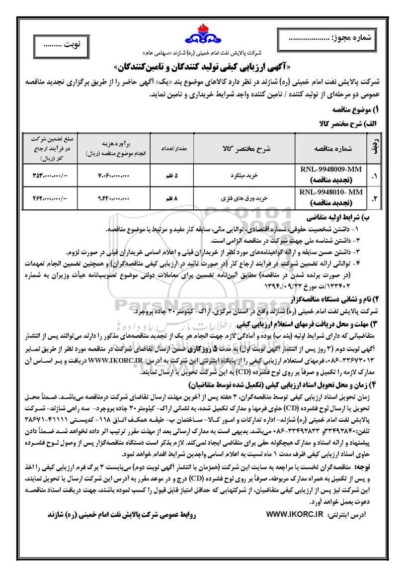 شرکت پالایش نفت امام خمینی (ره) شازند در نظر دارد کالاهای موضوع بند یک آگهی حاضر را از طریق برگزاری تجدید مناقصه عمومی دو مرحله ای از تولیدکننده / تامین کننده واجد شرایط خریداری و تامین نماید