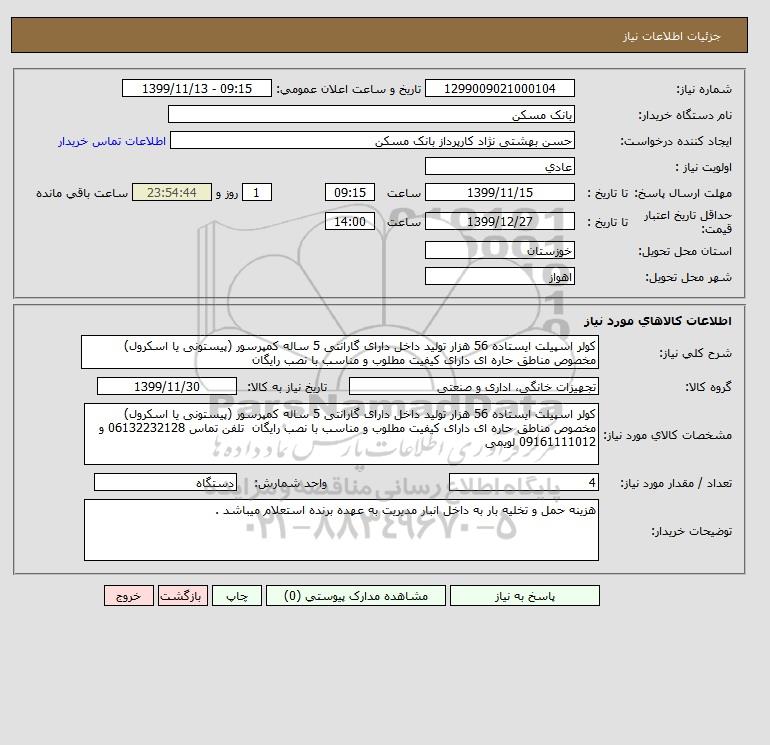مشخصات کالای مورد نیاز: کولر اسپیلت ایستاده 56 هزار تولید داخل دارای گارانتی 5 ساله کمپرسور (پیستونی یا اسکرول) مخصوص مناطق حاره ای دارای کیفیت مطلوب و مناسب با نصب رایگان تلفن تماس 06132232128 و 09161111012 لویمی