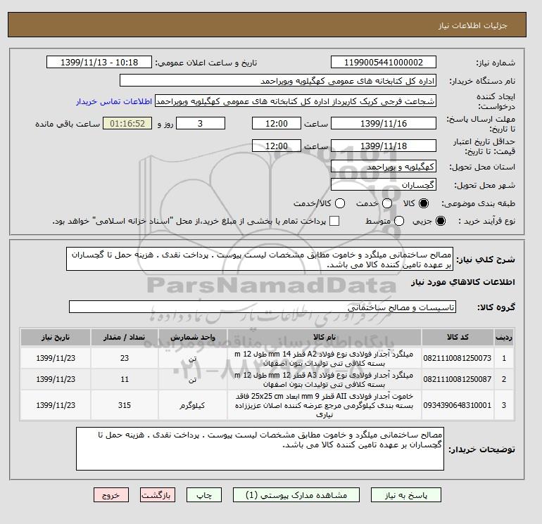 شرح کلی نیاز: مصالح ساختمانی میلگرد و خاموت مطابق مشخصات لیست پیوست . پرداخت نقدی . هزینه حمل تا گچساران بر عهده تامین کننده کالا می باشد.