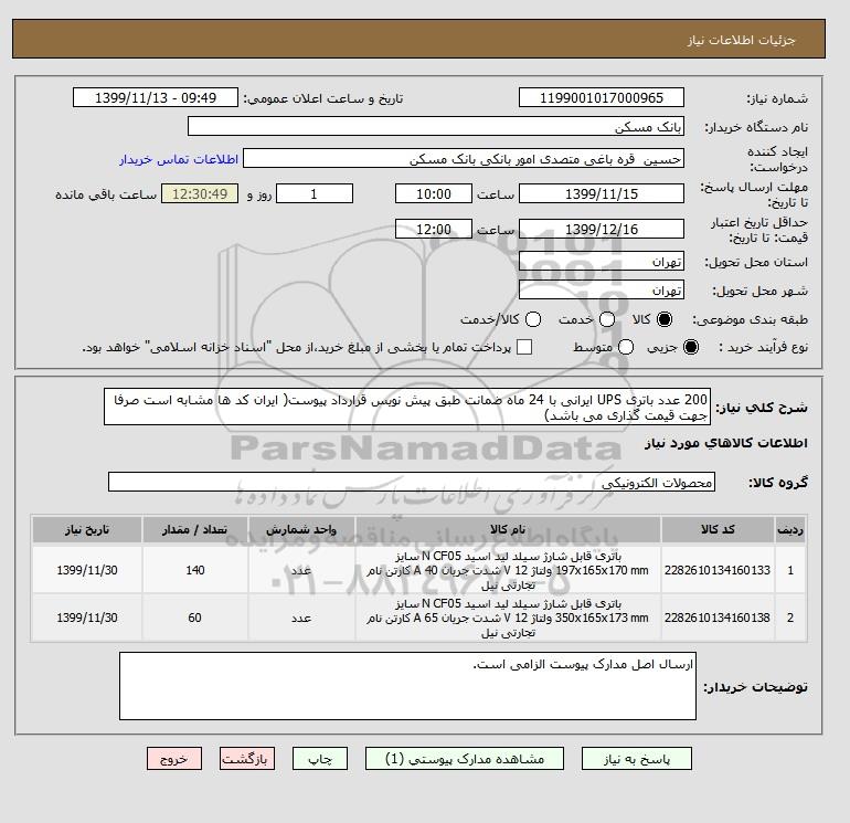 شرح کلی نیاز: 200 عدد باتری UPS ایرانی با 24 ماه ضمانت طبق پیش نویس قرارداد پیوست( ایران کد ها مشابه است صرفا جهت قیمت گذاری می باشد)