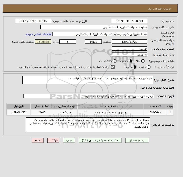 شرح کلی نیاز: اجرای پروژه مرمت و بازسازی حوضچه تغذیه مصنوعی خروشاد فراشبند