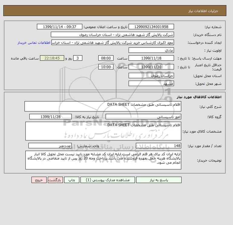 نام دستگاه خریدار:شرکت پالایش گاز شهید هاشمی نژاد - استان خراسان رضوی