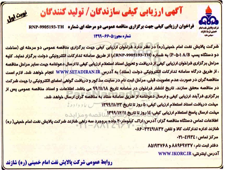 شرکت پالایش نفت امام خمینی (ره) در نظر دارد فراخوان ارزیابی کیفی جهت برگزاری مناقصه عمومی دو مرحله ای ساخت دو دستگاه پمپ A/B 501 - P به شماره RNP-9905193-TH را از طریق سامانه تدارکات الکترونیکی دولت برگزار نماید کلیه مراحل برگزاری فراخوان ارزیابی کیفی از دریافت و تحویل اسناد استعلام ارزیابی کیفی تا ارسال دعوتنامه جهت سایر مراحل مناقصه از طریق درگاه سامانه تدارکات الکترونیکی دولت ستاد ایران انجام خواهد شد لازم است مناقصه گران در صورت عدم عضویت قبلی مراحل ثبت نام در سایت مذکور و دریافت گواهی امضای الکترونیکی را جهت شرکت در مناقصه محقق سازند. تاریخ انتشار فراخوان در سامانه تاریخ 99.11.18 می باشد. اطلاعات و اسناد مناقصه عمومی پس از برگزاری فرآیند ارزیابی کیفی و ارسال دعوتنامه از طریق سامانه ستاد به مناقصه گران ارسال خواهد شد.