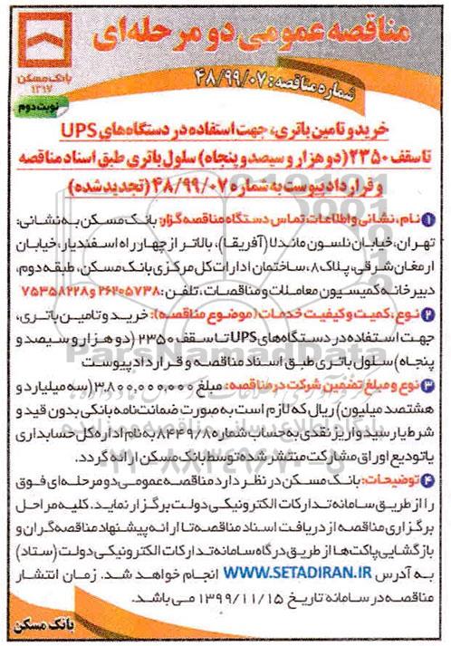 خرید و تامین باتری جهت استفاده در دستگاه های UPS تا سقف 2350 (دوهزار و سیصد و پنجاه) سلول باتری طبق اسناد مناقصه و قرارداد پیوست به شماره 48.99.07 تجدید شده