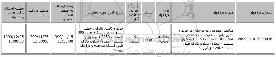 2099001017000036 | مناقصه عمومی دو مرحله ای خرید و تامین باتری ، جهت استفاده در دستگاه های UPS تا سقف 2350 (دو هزار و سیصد و پنجاه) سلول باتری طبق اسناد مناقصه و قرارداد | مناقصه عمومی | تهران | بانک مسکن | خرید و تامین باتری ، جهت استفاده در دستگاه های UPS تا سقف 2350 (دو هزار و سیصد و پنجاه) سلول باتری طبق اسناد مناقصه و قرارداد پیوست. | 1399/11/15 11:30:00 | 1399/11/25 13:00:00 | 1399/12/05 13:00:00 |