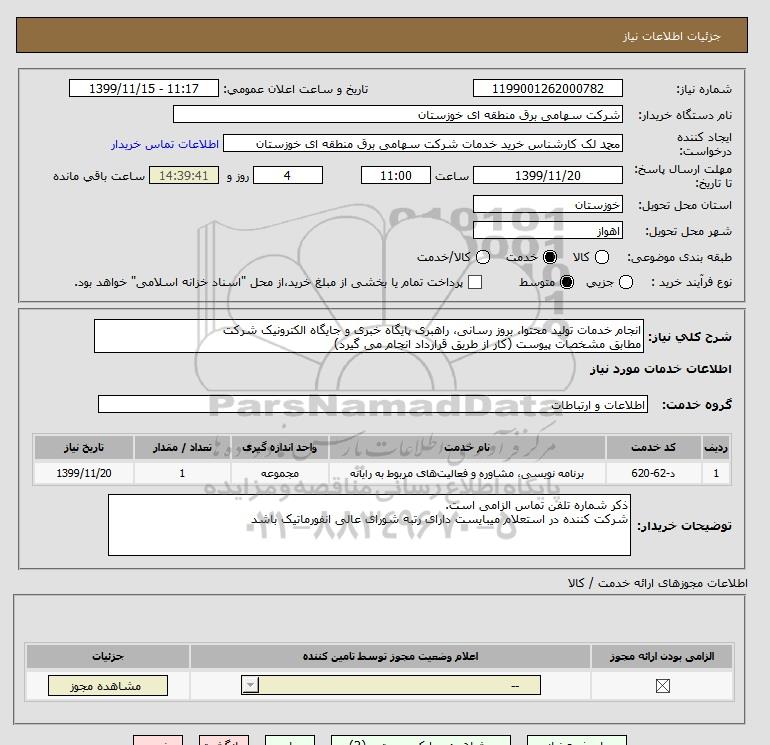 شرح کلی نیاز: انجام خدمات تولید محتوا، بروز رسانی، راهبری پایگاه خبری و جایگاه الکترونیک شرکت