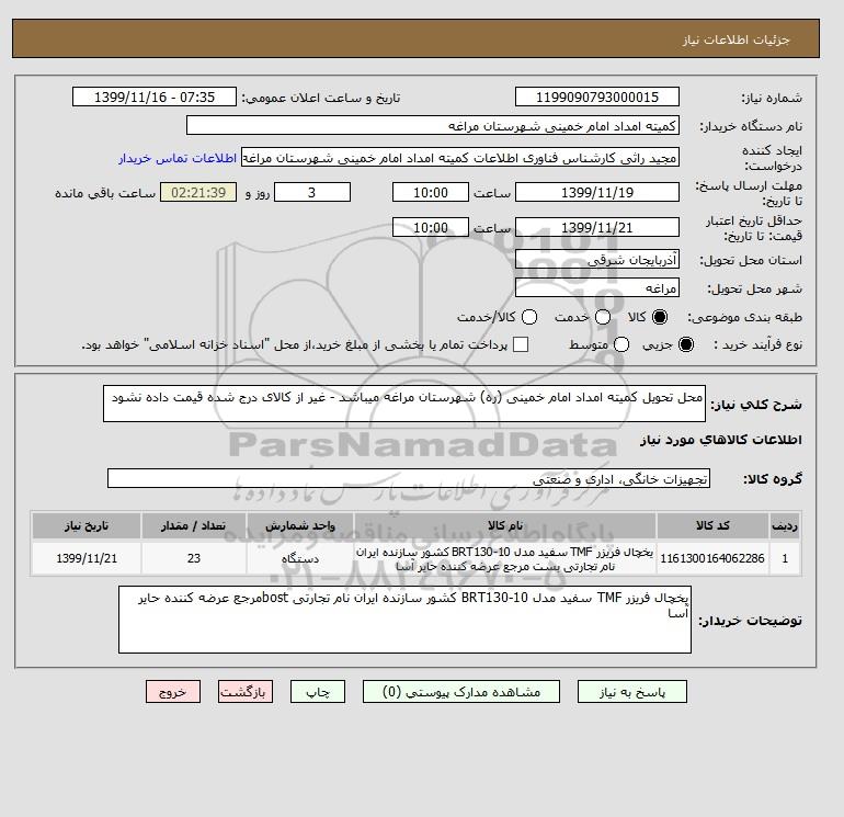 شرح کلی نیاز: محل تحویل کمیته امداد امام خمینی (ره) شهرستان مراغه میباشد - غیر از کالای درج شده قیمت داده نشود