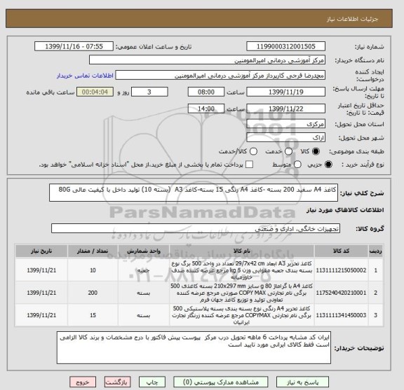 شرح کلی نیاز: کاغذ A4 سفید 200 بسته -کاغذ A4 رنگی 15 بسته-کاغذ A3 (بسته 10) تولید داخل با کیفیت عالی 80G