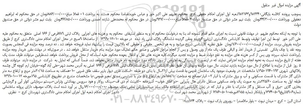 با توجه به اینکه محکوم علیهم  در مهلت قانونی نسبت به اجرای حکم اقدام ننموده اند بنا به درخواست محکوم له و به منظور استیفای  محکوم به و هزینه های اجرایی  پلاک ثبتی 789فرعی از 166 اصلی  متعلق به محکوم علیه علی اکبر خور  توسط این اجرا توقیف وتوسط کارشناس دادگستری ارزیابی گردیده ومقرر گردیده ششدانگ پلاک ثبتی یاد شده  در مورخه 10-12-1399  از ساعت8تا 9صبح در محل اجرای احکام مدنی دادگستری کرج از طریق مزایده بفروش برسد. مزایده از قیمت1/600/000/000تومان  طبق نظریه کارشناسی شروع میشود و به هر شخص  حقیقی و حقوقی که بالاترین قیمت را پیشنهاد نماید فروخته خواهد شد . ده درصد وجه مزایده فی المجلس بصورت وجه نقد یا چک بانکی  تضمینی از خریدار اخذ و الباقی ظرف یک ماه از وی وصول و پس از انجام مراحل قانونی و صدور حکم تملیک مورد مزایده بنام خریدار منتقل خواهد شد . در صورتیکه در مهلت مقرر خریدار وجه مزایده راپرداخت ننماید سپرده وی پس از کسر هزینه های مزایده به نفع دولت ضبط و مزایده تجدید میگردد.کلیه هزینه های نقل و انتقال بعهده محکوم علیه است.که از محل فروش پرداخت خواهد شد.طرفین میتوانند ظرف مدت یک هفته از تاریخ مزایده نسبت به نحوه انجام مزایده اعتراض نمایند که در اینصورت تا رسیدگی به اعتراض از سوی دادگاه مورد مزایده به نام خریدار منتقل نخواهد شد. ضمناً کسانی که تمایل به  شرکت  در مزایده دارند  میتوانند ظرف 5 روز  قبل از مزایده با اطلاع از مال مورد مزایده بازدید نمایند. مال مورد مزایده و بهای آن طبق نظر کارشناس بدین شرح است:پلاک ثبتی 789 فرعی از 166 اصلی به آدرس محمد شهر-علی آباد گونه-خیابان ارم کوچه گل چشمه پلاکهای شهری 193-194-195با مشخصات :در وضعیت موجود یک ساختمان قدیمی با قدمت بیش از21سال با بنای دو طبقه -اسکلت فلزی دیوار باربر سقف طاق ضربی -1-همکف به مساحت 20/15متر مربع و ارتفاع سه متر دارای گاز مشترک با قسمت مسکونی و آب و برق مشترک با انبار 2- انبار مصالح به مساحت 188/10متر به ارتفاع 5/5 متر با دسترسی مستق معبر عمومی-با مشخصات مندرج در نظریهخ کارشناسی 195مورخه 12-10-1399  طبقه اول به مساحت 225/60متر به صورت یک واحد مسکونی مستقل داذرای هال پذیرایی -دو اطاق خواب- آشپزخانه -کابینت ام دی اف-سینک روکار و هود سرویس بهداشتی وتراس-سیستم سرمایشی کولر آبی و گرمایشی بخاری گازی -برق و آآب مستقل و گاز مشترک با دفتر و انبار که در زمان کارشناسی در استفاده مالک سند میباشدوارزش تمامی ملک موصوف 16/000/000/000ریال بر آورد شده است پلاک موصوف دارای پروانه ساختمانی شماره5906تاریخ9-5-1374و پایانکار شماره 7155مورخه10-5-1386 از شهرداری محمد شهر است