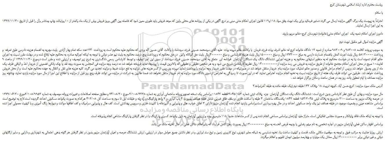 به موجب پرونده کلاسه 983008 و 983009 صادره از شعبه 12 دادگاه خانواده کرج له: خانم اشرف بیات فرزند فرمان با وکالت خانم سپیده بیات علیه :آقای سیدمحمد حسینی فرزند سیدداماد با وکالت آقای حسین آله وردی که محکوم علیه محکوم است به پرداخت 124عدد سکه تمام بهار آزادی بابت مهریه به انضمام هزینه دادرسی طبق تعرفه و پرداخت 58120000 ریال بابت اجرت المثل بانضمام خسارت دارسی به مبلغ 1773000ریال و مبلغ 1500000ریال بابت هزینه کارشناسی و مبلغ 4000000ریال بابت حق الوکاله وکیل در حق محکوم له و پرداخت پنج درصد محکوم به بابت نیم عشر دولتی با توجه به اینکه اجرائیه صادره به محکوم علیه ابلاغ شده و در مهلت مقرر نسبت به اجرای حکم اقدام ننموده است بنا به در خواست محکوم له به منظور استیفای محکوم به و هزینه اجرایی ششدانگ دانگ یک دستگان آپارتمان قولنامه ای متعلق به آقای سیدمحمد حسینی فرزند سیدداماد از سوی این اجرا توقیف و توسط کارشناس رسمی دادگستری به شرح زیر توصیف و ارزیابی شده و مقرر است درمورخ 1399/11/30 از ساعت 9 لغایت10 صبح در محل اجرای احکام مجتمع خانواده از طریق مزایده به فروش می رسد مزایده از14000000000 ریال نظریه کارشناسی شروع می شود و به هر شخص حقیقی و حقوقی که بالاترین قیمت را پیشنهاد نماید فروخته خواهد شد ده درصد وجه مزایده فی المجلس به صورت وجه نقد یا چک بانکی تضمینی از خریدار اخذ و الباقی ظرف یک ماه از وی وصول خواهد شد و پس از انجام مراحل قانونی و صدور حکم تملیک مورد مزایده بنام خریدار منتقل خواهد شد در صورتیکه در مهلت مقرر خریدار وجه مزایده را پرداخت ننماید سپرده وی پس از کسر هزینه های مزایده به نفع دولت ضبط و مزایده تجدید می گردد کلیه هزینه های نقل و انتقال به عهده محکوم علیه است و از محل فروش پرداخت خواهد شد . طرفین می توانند ظرف یک هفته از تاریخ مزایده نسبت به نحوه انجام مزایده اعتراض نمایند که در این صورت تا رسیدگی به اعتراض از سوی دادگاه مورد مزایده به نام خریدار منتقل نخواهد شد ضمنا طالبین به شرکت در مزایده می توانند ظرف پنج روز قبل از مزایده با اطلاع این اجرا از مال مورد مزایده بازدید نمایند چنانچه روز مزایده مصادف با ایام تعطیل باشد روز بعد در همان ساعت و مکان برگزار خواهد شد .