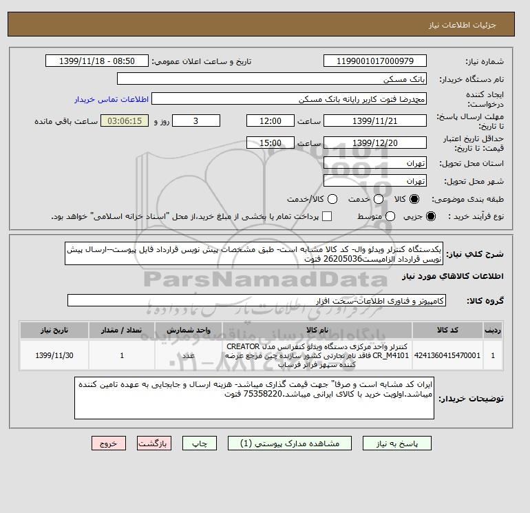 شرح کلی نیاز: یکدستگاه کنترلر ویدئو وال- کد کالا مشابه است- طبق مشخصات پیش نویس قرارداد فایل پیوست--ارسال پیش نویس قرارداد الزامیست26205036 فتوت