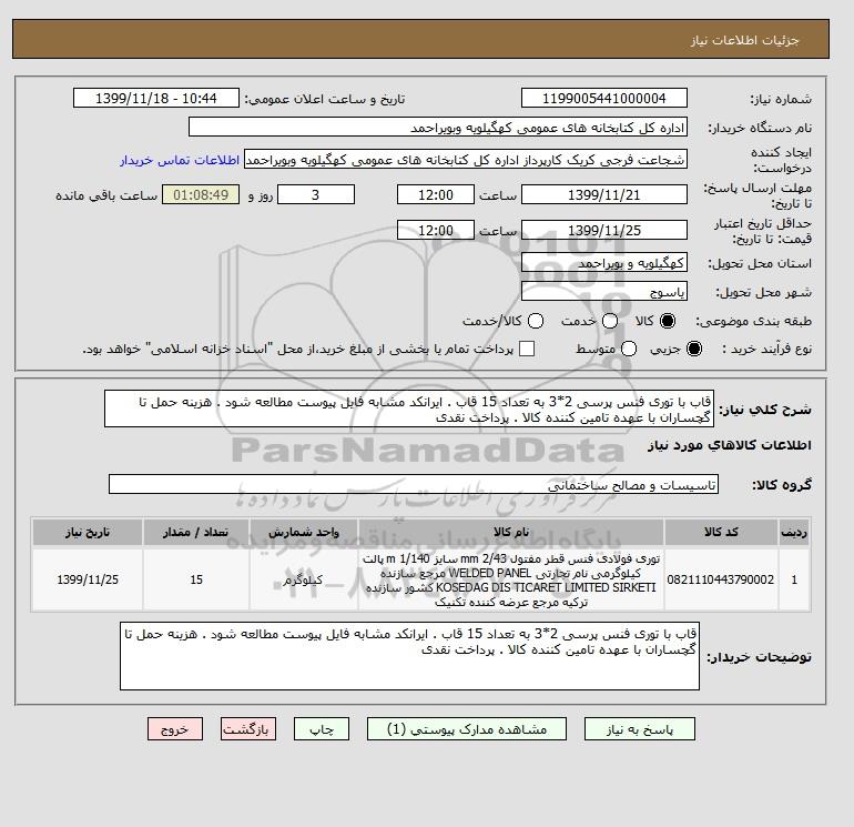 شرح کلی نیاز: قاب با توری فنس پرسی 2*3 به تعداد 15 قاب . ایرانکد مشابه فایل پیوست مطالعه شود . هزینه حمل تا گچساران با عهده تامین کننده کالا . پرداخت نقدی