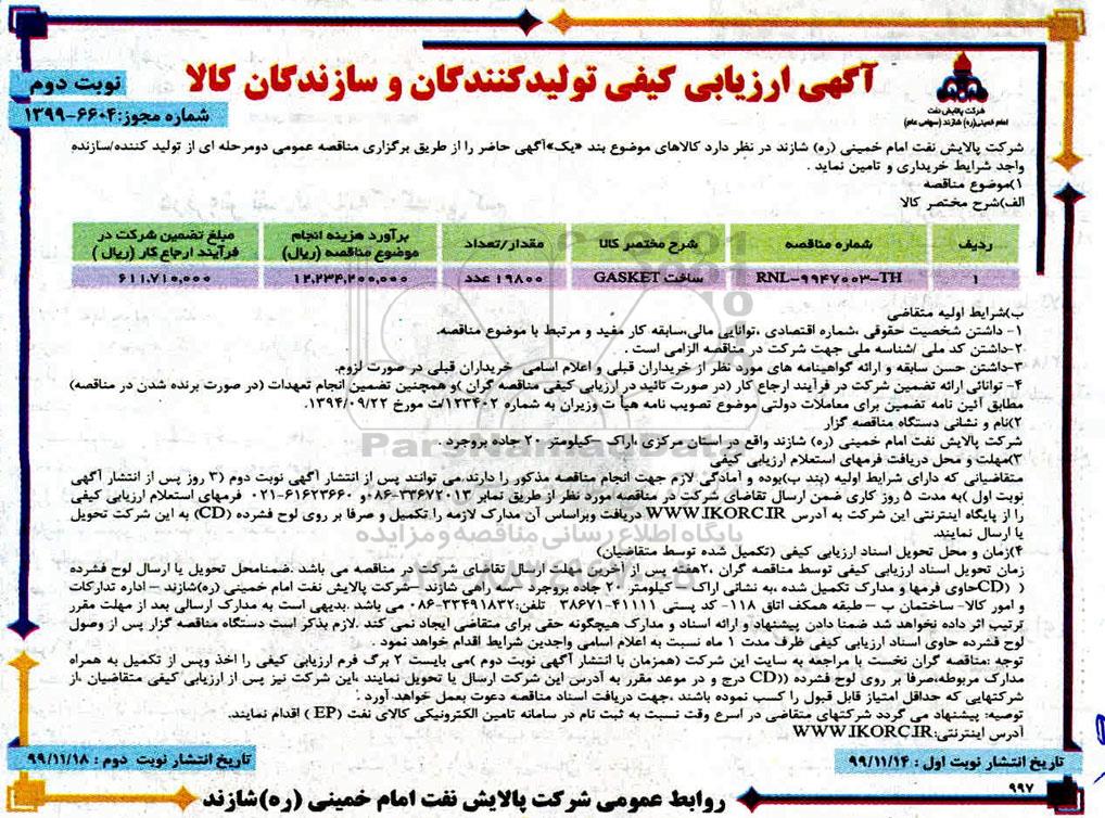 | 1 | RNL-9947003- TH | ساخت GASKET | 19800 عدد | 12.234.200.000 | 611.710.000 |