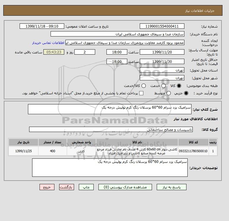 شرح کلی نیاز: سرامیک یزد سرام 60*60 پرسلان رنگ کرم پولیش درجه یک