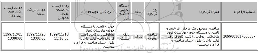 2099001017000037 | مناقصه عمومی یک مرحله ای خرید و تامین 6 دستگاه خودرو پولرسان تویوتا هایلوکس دوکابین (تغییر کاربری یافته تولید داخل) طبق اسناد مناقصه و قرارداد پیوست. | مناقصه عمومی | تهران | بانک مسکن | خرید و تامین 6 دستگاه خودرو پولرسان تویوتا هایلوکس دوکابین (تغییر کاربری یافته تولید داخل) طبق اسناد مناقصه و قرارداد پیوست. | 1399/11/18 11:10:00 | 1399/11/25 13:00:00 | 1399/12/05 13:00:00 |