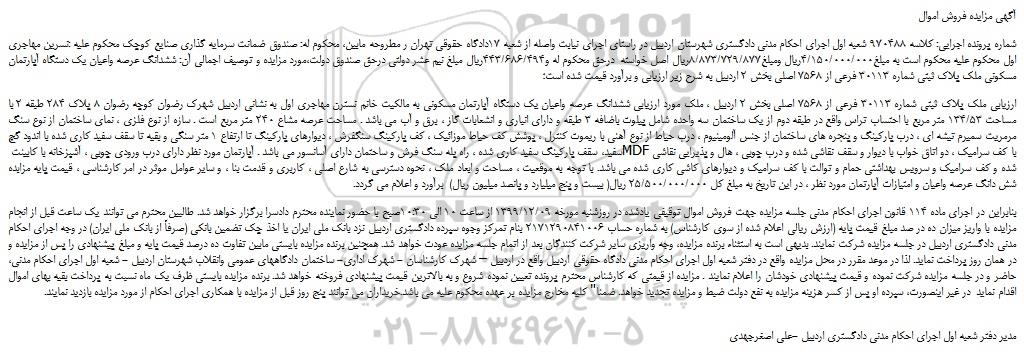 شماره پرونده اجرایی: کلاسه 970488 شعبه اول اجرای احکام مدنی دادگستری شهرستان اردبیل در راستای اجرای نیابت واصله از شعبه 17دادگاه حقوقی تهران ر مطروحه مابین، محکوم له: صندوق ضمانت سرمایه گذاری صنایع کوچک محکوم علیه :نسرین مهاجری اول محکوم علیه محکوم است به مبلغ4/150/000/000ریال ومبلغ8/873/729/877ریال اصل خواسته درحق محکوم له و443/686/494ریال مبلغ نیم عشر دولتی درحق صندوق دولت،مورد مزایده و توصیف اجمالی آن: ششدانگ عرصه واعیان یک دستگاه آپارتمان مسکونی ملک پلاک ثبتی شماره 30113 فرعی از 7568 اصلی بخش 2 اردبیل به شرح زیر ارزیابی و برآورد قیمت شده است؛
