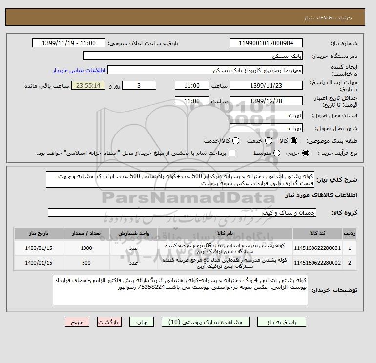استعلام بها و موضوع استعلام استعلام کوله پشتی ابتدایی دخترانه و پسرانه هرکدام 500 عدد+کوله راهنمایی 500 عدد. ایران کد مشابه و جهت قیمت گذاری طبق قرارداد. عکس نمونه پیوست به اطلاع کلیه شرکتها و افراد متخصص واجد شرایط میرساند، آگهی گذار در نظر دارد از طریق استعلام بها، نسبت به انتخاب و دریافت پیشنهادات اقدام نماید. این استعلام با کد آگهی ثبت شده در سامانه خبرگزاری پارس نماد : 3153994 منتشر شده است. مشخصات استعلام : تاریخ شروع استعلام: 1399/11/19 آخرین مهلت ارسال پیشنهاد قیمت : 1399/11/22 و محل اجرای پروژه : استان تهران میباشد. استعلام قیمت مورد درخواست : استعلام کوله پشتی ابتدایی دخترانه و پسرانه هرکدام 500 عدد+کوله راهنمایی 500 عدد. ایران کد مشابه و جهت قیمت گذاری طبق قرارداد. عکس نمونه پیوست با دستهبندیهای تخصصی و گروه های مرتبط : البسه و پوشاک, استعلام اطلاع رسانی میگردد. شرایط شرکت در استعلام آنلاین : ابتدا ثبت نام در سامانه استعلام پارس نماد و تکمیل مدارک موردنیاز و بارگذاری در سامانه رعایت تمامی ضوابط و الزامات مندرج در اسناد استعلام است.