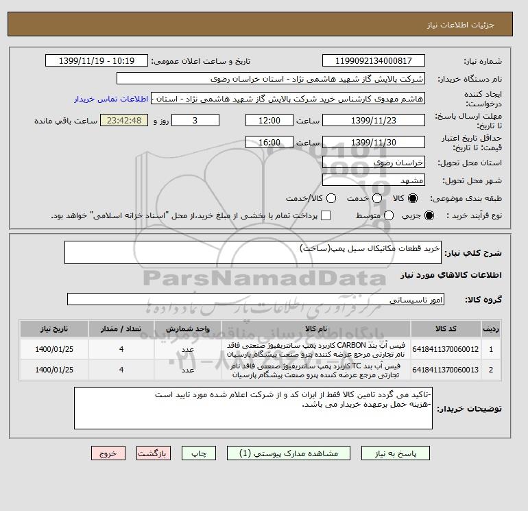 استعلام خرید قطعات مکانیکال سیل پمپ(ساخت), استعلام خرید قطعات مکانیکال سیل پمپ(ساخت)