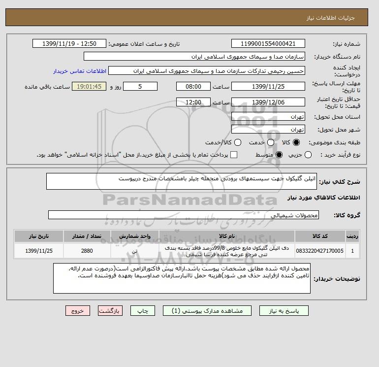 شرح کلی نیاز: اتیلن گلیکول جهت سیستمهای برودتی منجمله چیلر بامشخصات مندرج درپیوست